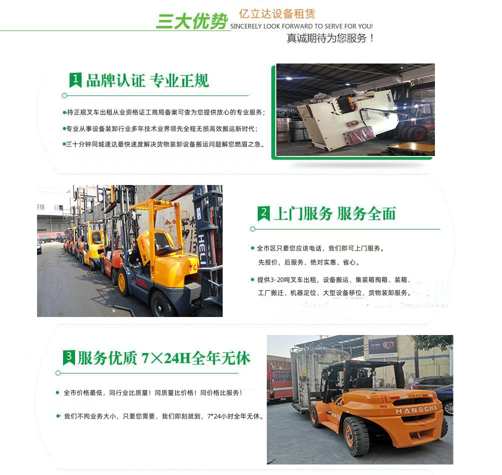 亿立达设备租赁有限公司是工商局准许的天津国土资源和房屋职业学院专业叉车出租公司,公司本着诚信、服务、效率、创新的经营理念,用精湛的技术,真诚的服务,为众多客户提供优质的服务,同时获得信赖与支持。专业提供天津国土资源和房屋职业学院3-20吨叉车出租、叉车租赁、设备搬运、集装箱掏箱装箱、机器移位定位、货物装卸、工厂搬迁、安全可靠,收费透明,价格便宜,随叫随到,24小时上门服务!本公司叉车吊车师傅对各种设备搬运装卸都有深刻探讨和研究。很多的疑难设备搬运,通过我公司的叉车师傅都能迎刃而解。对各种进口设备、国产机器、大型设备搬迁、高难度搬迁、各种精密仪器、医疗设备、科研设备等都能搬运; 提供全市 24 小时上门装卸搬运服务。同时提供厂房搬迁服务。 ...